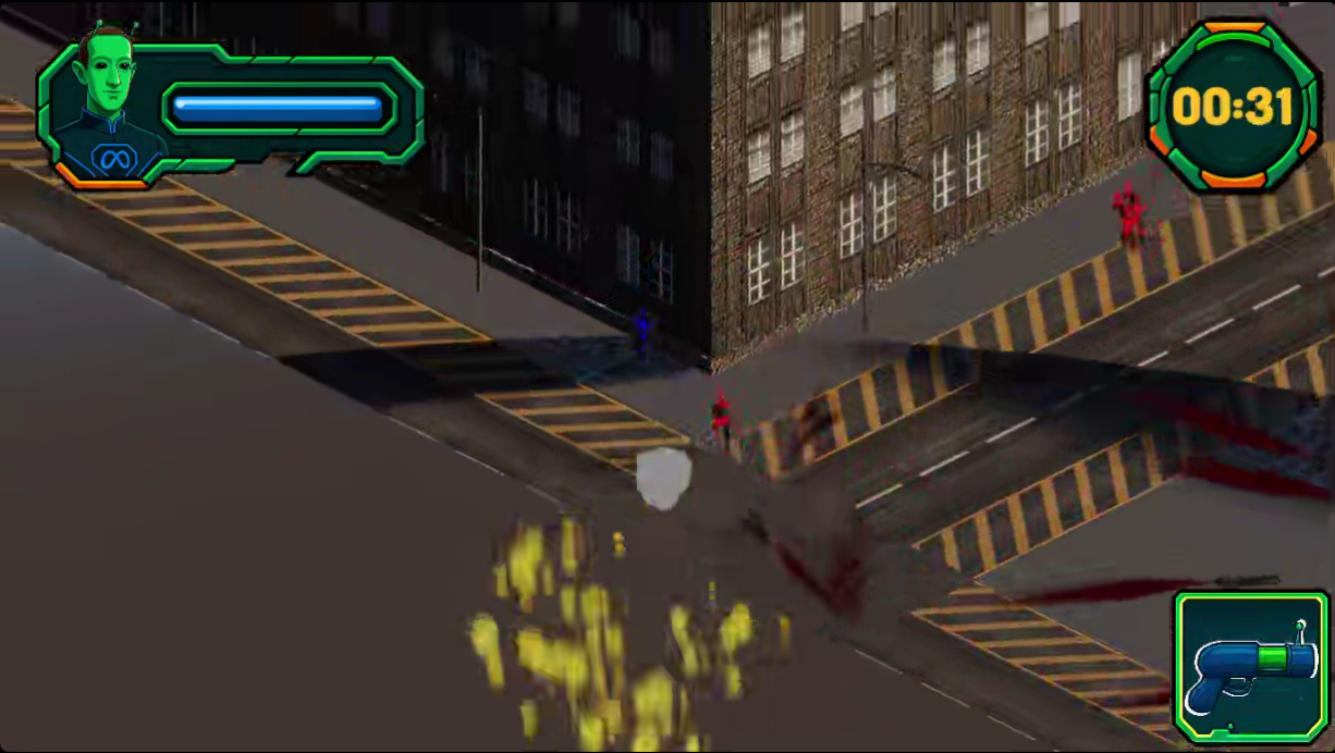 Mark Invader es un juego de supervivencia con vista isométrica y estética retro-futurista sci-fi. En esta parodia cómica, una versión alienígena de Mark Zuckerberg debe evadir al gobierno de los Estados Unidos que intenta deportarlo a su planeta natal.